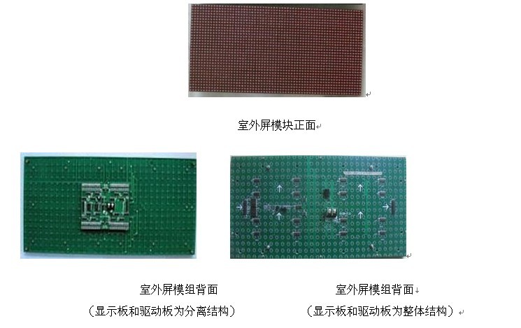 上圖為16x8(2紅)的室外屏模組。加了防水結(jié)構(gòu)用于全戶外,我們可以看到塑料殼體,最右側(cè)是它的整個(gè)結(jié)構(gòu)刨圖:顯示板上插的是燈珠、背板上是顯示驅(qū)動(dòng)電路,這是分體結(jié)構(gòu)的,也有的是將顯示板和顯示驅(qū)動(dòng)電路做在一塊電路板上的整體結(jié)構(gòu)的,下面的兩個(gè)圖我們可以看到區(qū)別。面板、后殼其實(shí)是一個(gè)塑料罩殼,面板上對(duì)應(yīng)燈珠位置開有孔,以使燈珠漏出頭,后殼上有用于安裝的螺絲孔或磁柱,使模塊便于組裝。模塊的前面灌有顯示屏專用的防水膠。