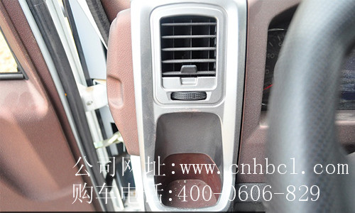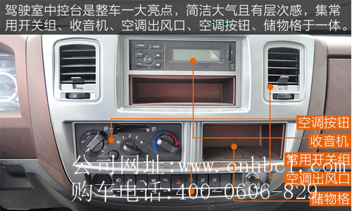 駕駛室中控臺是整車一大亮點,簡潔大氣且有層次感,集常用開關組、收音機、空調出風口、空調按鈕、儲物格于一體,秩序井然,有條不紊。