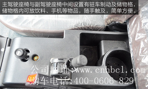 主駕駛座椅與副駕駛座椅中間設置有駐車制動及儲物格,儲物格內可放飲料、手機等物品,隨手觸及,簡單方便。