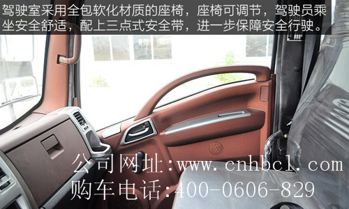 駕駛室采用全包軟化材質的座椅,座椅可調節(jié),駕駛員乘坐安全舒適,配上三點式安全帶,進一步保障安全行駛。駕駛室車門及靠近前風窗邊緣均設置有香檳金的安全扶手,奢華、安全盡顯。