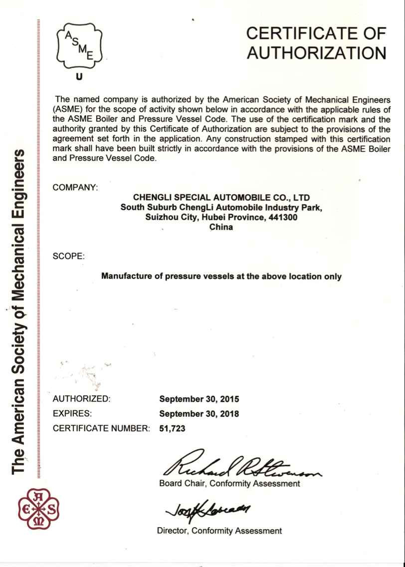 程力專用汽車股份有限公司具有A2、C2、C3壓力容器生產資質,在經營中秉承客戶第一、質量至上的管理理念,不斷開拓新的市場,搶占制高點,隨著出口業(yè)務的不斷拓展,我程力公司領導和員工心往一處想,勁往一處使,不斷開發(fā)新產品,從源頭到過程層層把關,確保產品質量。程力專用汽車股份有限公司壓力容器榮獲ASME認證.