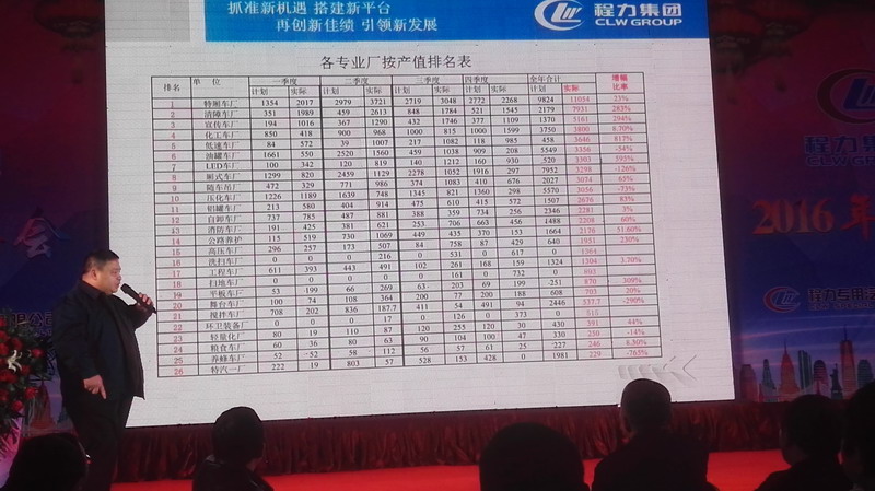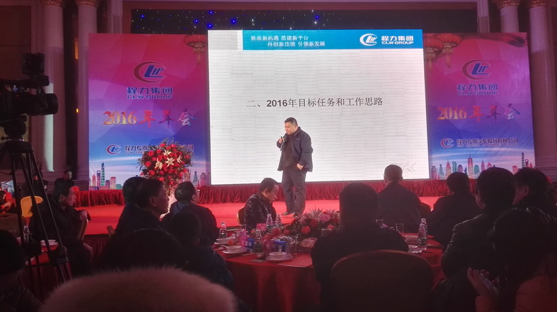 年會(huì)首先由公司法人,總經(jīng)理程阿羅致詞,回顧2015年度,在國(guó)際國(guó)內(nèi)經(jīng)濟(jì)全面疲軟的情況之下,程力集團(tuán)任然取得了不凡的業(yè)績(jī),2015年度總產(chǎn)值突破20億元,其中程力特種廂式分廠產(chǎn)值突破1.2億元,清障車分廠突破億元,14個(gè)其它分廠突破2000萬元.