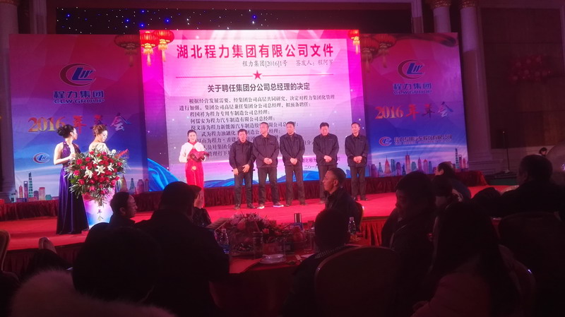 回顧2015,展望2016,程總勾畫2016年度工作任務(wù)及思路,布局程力集團(tuán)構(gòu)建大平臺(tái)戰(zhàn)略規(guī)劃并分步實(shí)施:1.在原有各專業(yè)廠基礎(chǔ)上成業(yè)程力專用車制造公司,人,財(cái),物分離,增強(qiáng)抗擊風(fēng)險(xiǎn)能力.2.在新316國(guó)道邊新征地1000畝,成立程力汽車制造公司,主要生產(chǎn)輕型車整車及專用二類底盤,3.成立程力新能源汽車股份有限公司,依托國(guó)家對(duì)新能源汽車政策,以及新能源汽車的逐步普及,重點(diǎn)謀劃新的增長(zhǎng)點(diǎn),并逐步單獨(dú)上市.4.也控股湖北大力專用汽車制造有限公司,依托大力客車資質(zhì),完善產(chǎn)品生產(chǎn)目錄,5.程力重工股份有限公司(武漢),在武漢天河機(jī)場(chǎng)附近,征地300畝,也開工建設(shè),利用地理,人才優(yōu)勢(shì),開發(fā)高端產(chǎn)品.6.程力油罐化工車制造公司,擬在新開發(fā)區(qū)引近國(guó)際一流的?;奋嚿a(chǎn)線,生產(chǎn)一流的油罐車,化工車,打造精品.7.程力善建金融公司及程力置力公司為程力集團(tuán)多元化發(fā)展戰(zhàn)略,依托主力,同步發(fā)展.