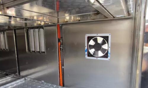 3、恒溫系統(tǒng)。由車載制冷機,暖風機,氣體混合輸送倉,排風扇等組成,實現(xiàn)仔豬生存空間氣體的流通和恒溫。為保證運輸過程中對溫度的控制,畜禽運輸車采用雙系統(tǒng)制冷空調(diào),且箱體兩側(cè)設(shè)計三排帶電動排氣扇的通風口和百葉窗,夏季通過空調(diào)實現(xiàn)箱內(nèi)降溫。為解決冬季畜禽運輸采暖,采用獨立的水暖系統(tǒng),采用智能巡檢儀,保證車廂內(nèi)恒溫28-32℃,在駕駛室就能實時監(jiān)測箱內(nèi)的溫度變化,便于控制溫度。
