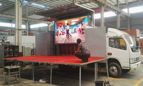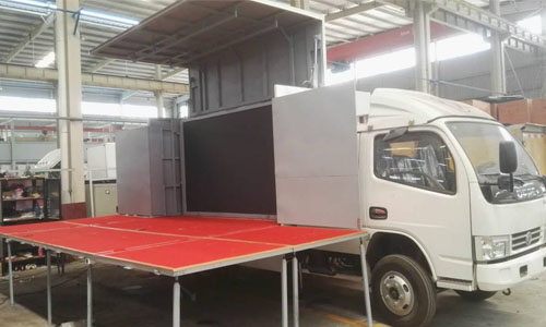 東風(fēng)雙排座流動舞臺車廂體左側(cè)帶頂部二分之一展開,油缸10條,液壓舞臺使用面積21平方,左右舞臺板加屏風(fēng),內(nèi)側(cè)另加一塊P5室內(nèi)全彩LED顯示屏(屏尺寸:2720*1600mm),可舉升,舉升高度80cm,