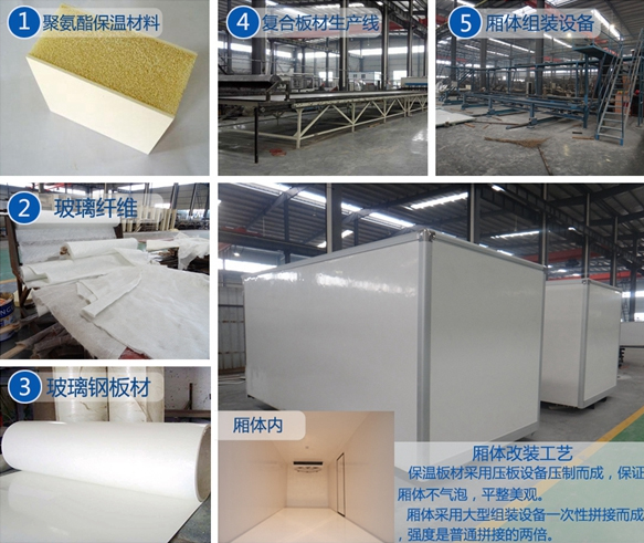 1、廂體采用聚酯濕法制板工藝和玻璃纖維加強(qiáng)全木廂體框架結(jié)構(gòu),全封閉聚氨酯板塊粘接法; 冷藏車廂體改裝