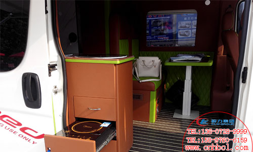 全車旅居區(qū)域全部采用游艇地板,有穩(wěn)定、耐磨、防潮、防腐、防酸、防堿、防蟲蛀、歷久彌新等其它普通實木無法企及的優(yōu)良特性,柚木在各種環(huán)境下不易變形。抽拉式灶臺采用的電磁爐,在這里可以做些戶外美食。進門后車身左側(cè)是一個升降桌和沙發(fā),夜間可以將升降桌降下,沙發(fā)靠背放桌上,與前面向后旋轉(zhuǎn)的駕駛座椅形成一張雙人床。
