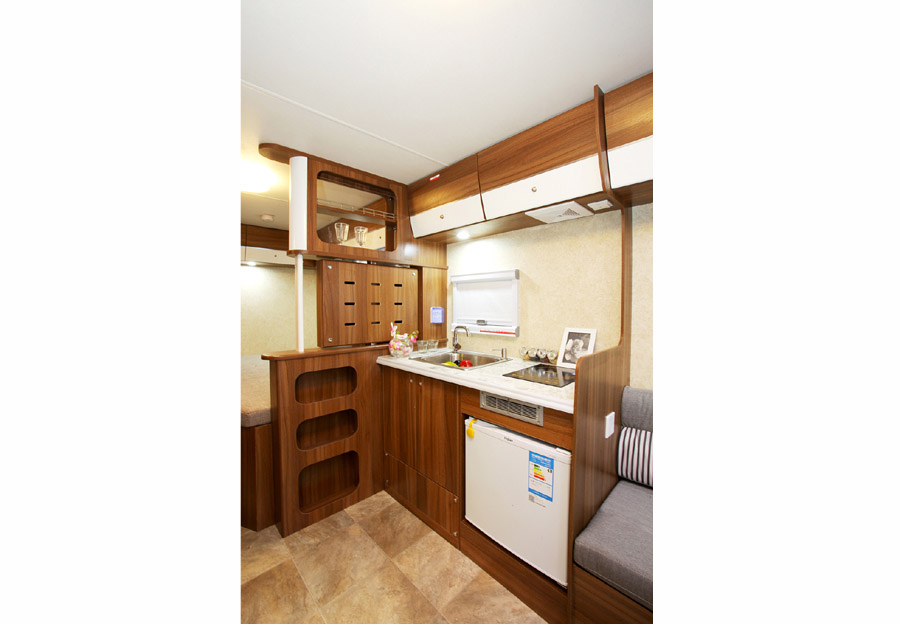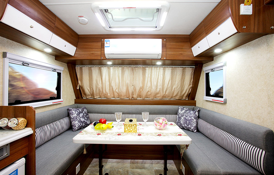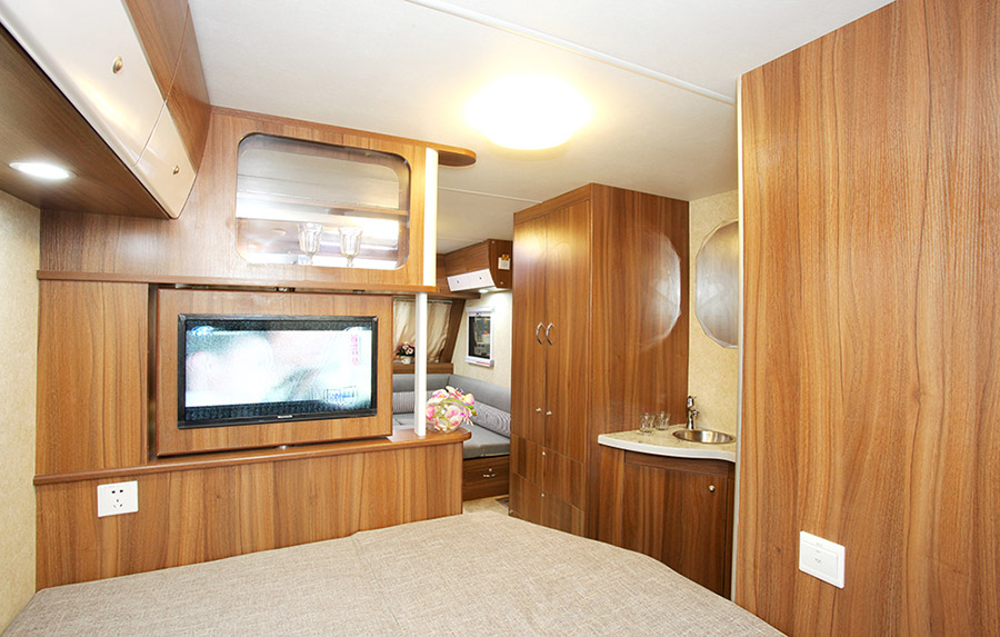 6、功能齊全,進(jìn)口三能源冰箱、拖掛房車專用座便器、熱水器、頂置空調(diào)