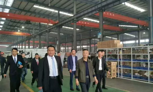 程力集團公司常務(wù)副總經(jīng)理程國祥(前右)帶領(lǐng)考察團參觀生產(chǎn)車間