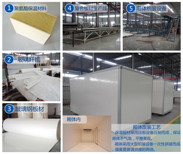 2、廂板材質(zhì):內(nèi)外壁板選用國內(nèi)優(yōu)質(zhì)的2.2mm玻璃鋼;中間保溫材料選用進(jìn)口聚氨酯;廂體厚度80mm,門厚度80mm;