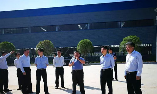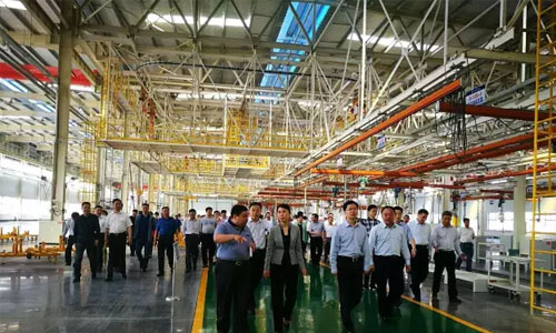 程力集團(tuán)總經(jīng)理程阿羅(前排左一)、市委書記陳安麗(左二)、市長郄英才(前排右二)、曾都區(qū)區(qū)委書記何運(yùn)平(右一),在程力商用車生產(chǎn)車間考察現(xiàn)場。