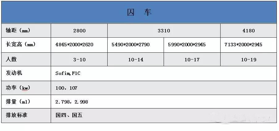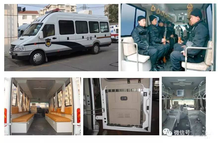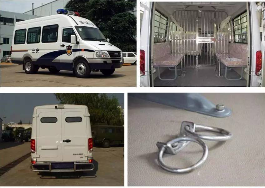 基本配置:車身警標、警用標識、警燈警報器、乘員座椅、戒具環(huán)、不銹鋼囚籠,附加長排座椅、飲水機等。