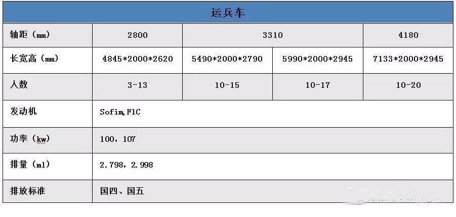 運兵車是針對公安部門處理緊急事故時為現(xiàn)場增派兵力的專用車輛。運兵車人數(shù)一般20人左右,要求快速運兵,并同時攜帶相關(guān)警用器械?;九渲茫好鎸γ骈L條座椅、扶欄、槍架等運兵專用裝置、可選裝全車防彈、照明設(shè)施、前后防撞保險杠、防爆裝置等 。