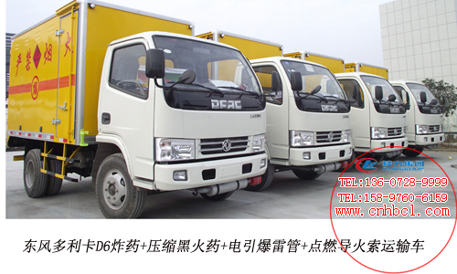 東風D6多利卡廂長4米爆破炸藥運輸車整車尺寸:CLW5071XQY5型爆破器材運輸車,底盤型號:EQ1070SJ3BDFWXP,國五壓縮黑火藥運輸車整車外形尺寸:5995X2150,2100X2800(mm),貨廂尺寸:4120X2000X1780 (mm),總質(zhì)量:7360kg,額定質(zhì)量:3365kg,3430kg,整備質(zhì)量:3800kg.危險貨物運輸車的車輛類型為:EX/Ⅲ,選裝右側(cè)無門箱體,整車寬(mm):2100;廂體頂部封閉,不可開啟: 運輸品名:黑火藥,爆破炸藥,壓縮黑火藥,電引爆雷管,點燃導火索,類項號:1.1D,1.1D,1.1D,1.1B,1.4G;防護材料:Q235A碳鋼.