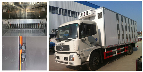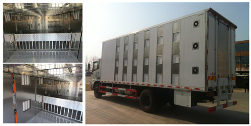 東風(fēng)天錦7.6米豬仔運(yùn)輸車(chē)箱體為全不銹鋼保溫結(jié)構(gòu),外部部分玻璃鋼飾板。