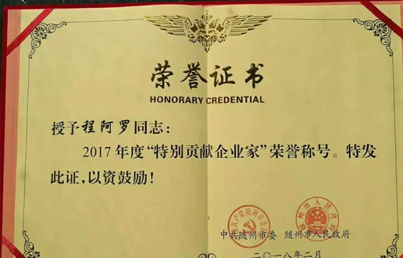 2月22日,隨州市市委、市政府在全省電視會議上表彰程力公司及程阿羅總經(jīng)理分別獲得特別貢獻獎和特別貢獻企業(yè)家榮譽稱號。