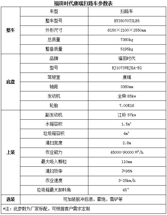福田時(shí)代康瑞H2掃路車(chē)底盤(pán)采用時(shí)代康瑞H2,3360軸距,全柴112馬力發(fā)動(dòng)機(jī),氣剎,動(dòng)轉(zhuǎn),ABS,7.00R16鋼絲胎,福田時(shí)代康瑞H2掃路車(chē)上裝配置參考:匹配江鈴57千瓦副發(fā)動(dòng)機(jī),中置4掃盤(pán)、三洋馬達(dá)、江鈴副發(fā)動(dòng)機(jī)、施耐德控制開(kāi)關(guān)、海普瑞斯電磁閥組、無(wú)級(jí)變速自動(dòng)離合器、免維護(hù)離心式風(fēng)機(jī)、不銹鋼垃圾箱、北極星電子水泵、垃圾箱舉升自卸、尾部LED箭頭燈、手動(dòng)泵應(yīng)急系統(tǒng),選裝配置:前沖后灑為選裝配置,垃圾箱自潔功能卷盤(pán)水槍為選裝配置,倒車(chē)影像作業(yè)監(jiān)控為選裝配置,價(jià)格另計(jì)。